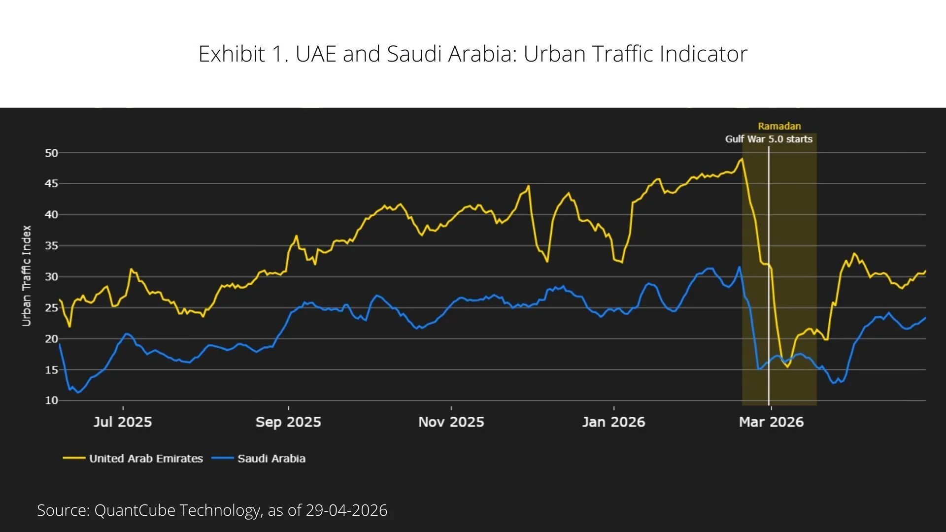 A comparison with Saudi Arabia reinforces this interpretation. While Ramadan effects are similar, the additional decline linked to the conflict is more limited – consistent with lower direct exposure of Saudi urban centres.