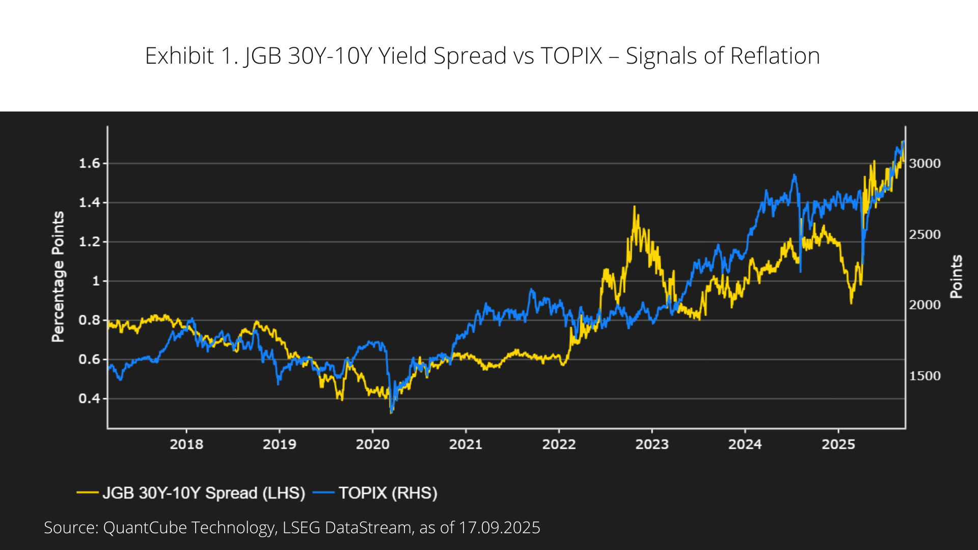 Exhibit 1 illustrates how markets are positioning for both rate normalization and sustainable growth. The widening of the JGB 30Y–10Y spread indicates investor anticipation of the BoJ’s gradual exit from ultra-loose monetary policy, while the parallel upward trend of the yield curve and the TOPIX since 2023 reflects a structural shift toward “reflation” and “interest rate normalization”. Shorter-term divergences, however, reveal tactical swings in sentiment, driven by the push-and-pull between BoJ interventions, external shocks, and market positioning.