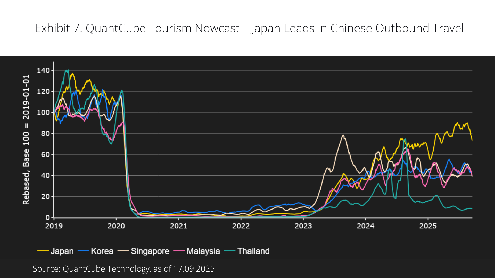 Japan’s tourism sector is experiencing a strong rebound, supported by the recovery in global flight capacity and the steady return of inbound flows from Korea, Southeast Asia, and most importantly China. As Exhibit 7 illustrates, Chinese tourists, in particular, have reemerged as the dominant driver of volume and spending, leveraging the weak yen to maximize purchasing power across retail, dining, and luxury goods.