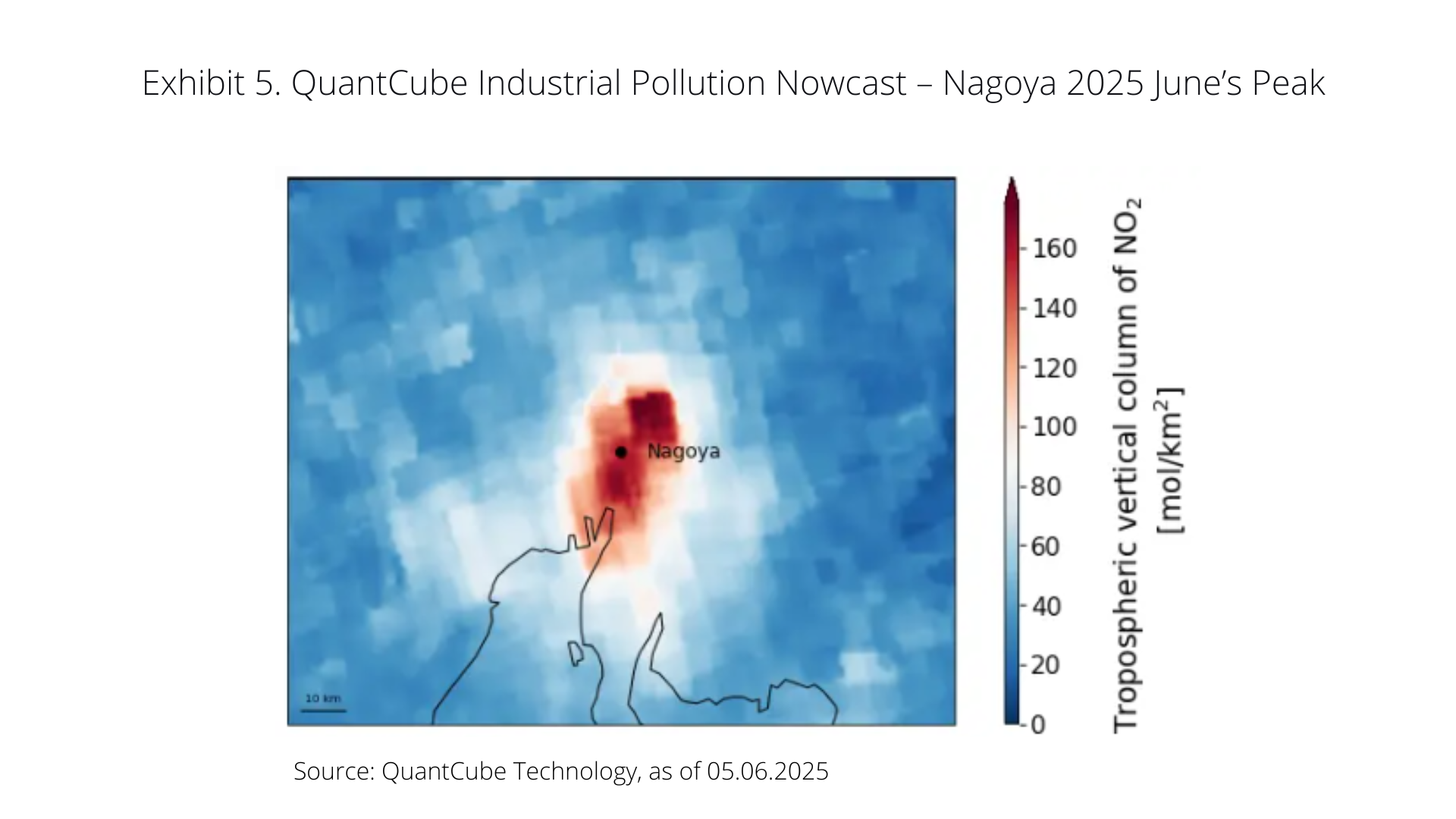Exhibit 5 highlights how QuantCube’s Industrial Pollution Indicator captured a sharp surge in atmospheric NO2 concentrations on June 5, 2025—the highest level recorded that month. This spike signals an intense, high-frequency burst of industrial activity and energy consumption, offering real-time evidence of resurgent momentum within Nagoya’s manufacturing base.