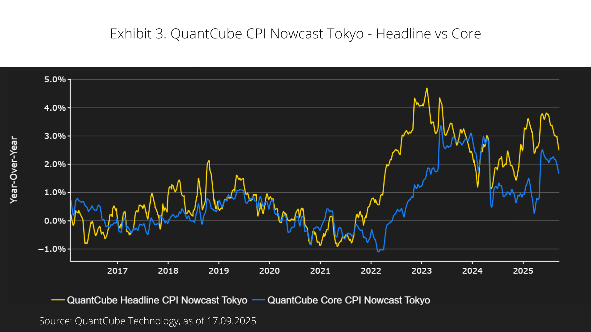 Inflation remains at the heart of Japan’s economic transition. A sustained pickup in prices has driven interest rates higher and continues to challenge the BoJ’s ability to normalize policy. For much of the past two years, producer price inflation (PPI) has hovered around 2%, pointing to relatively soft imported inflation. This has given Japan a window to shift from an externally driven, import-cost model toward a more sustainable framework anchored in domestic demand. Encouragingly, core inflation is now converging more closely with headline measures, suggesting that price dynamics are becoming more internally generated. (Exhibit 2 and 3)