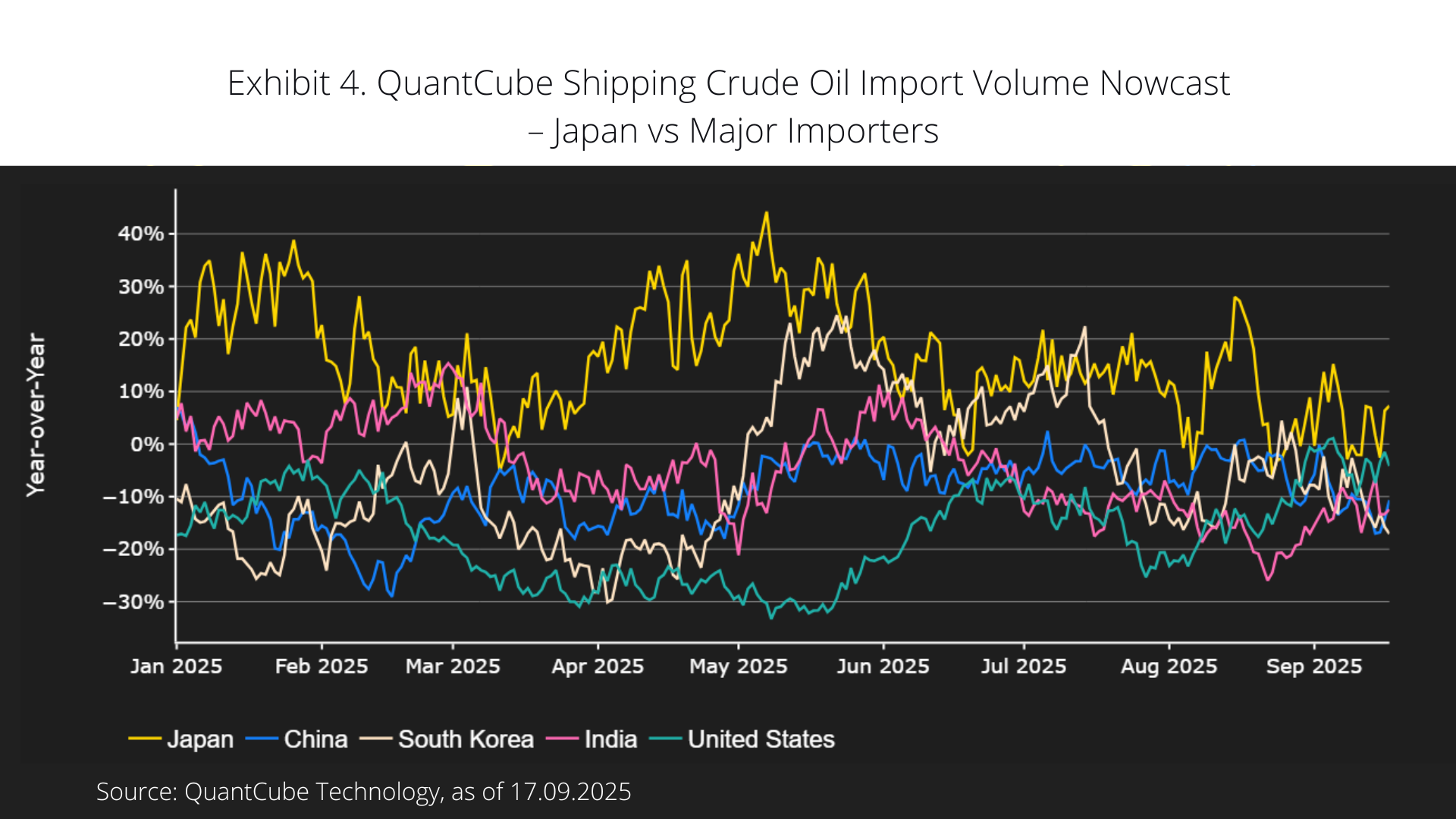 QuantCube Shipping Crude Oil Import Volume Nowcast (Exhibit 4) reveals a striking divergence in oil import dynamics among the world’s top five importers over the past year. The United States (–4.2%), South Korea (–17.2%), India (–12.4%), and China (-10.7%) all registered year-on-year declines, consistent with weaker global growth, tighter monetary conditions, and the structural shift toward renewables. Japan, however, stands out as the clear outlier as Exhibit 4 illustrates. Oil imports surged by +7.3%, the only positive figure among its peers and by far the strongest. This resilience suggests that Japan’s energy demand is not merely stable but expanding at a time when others are scaling back.