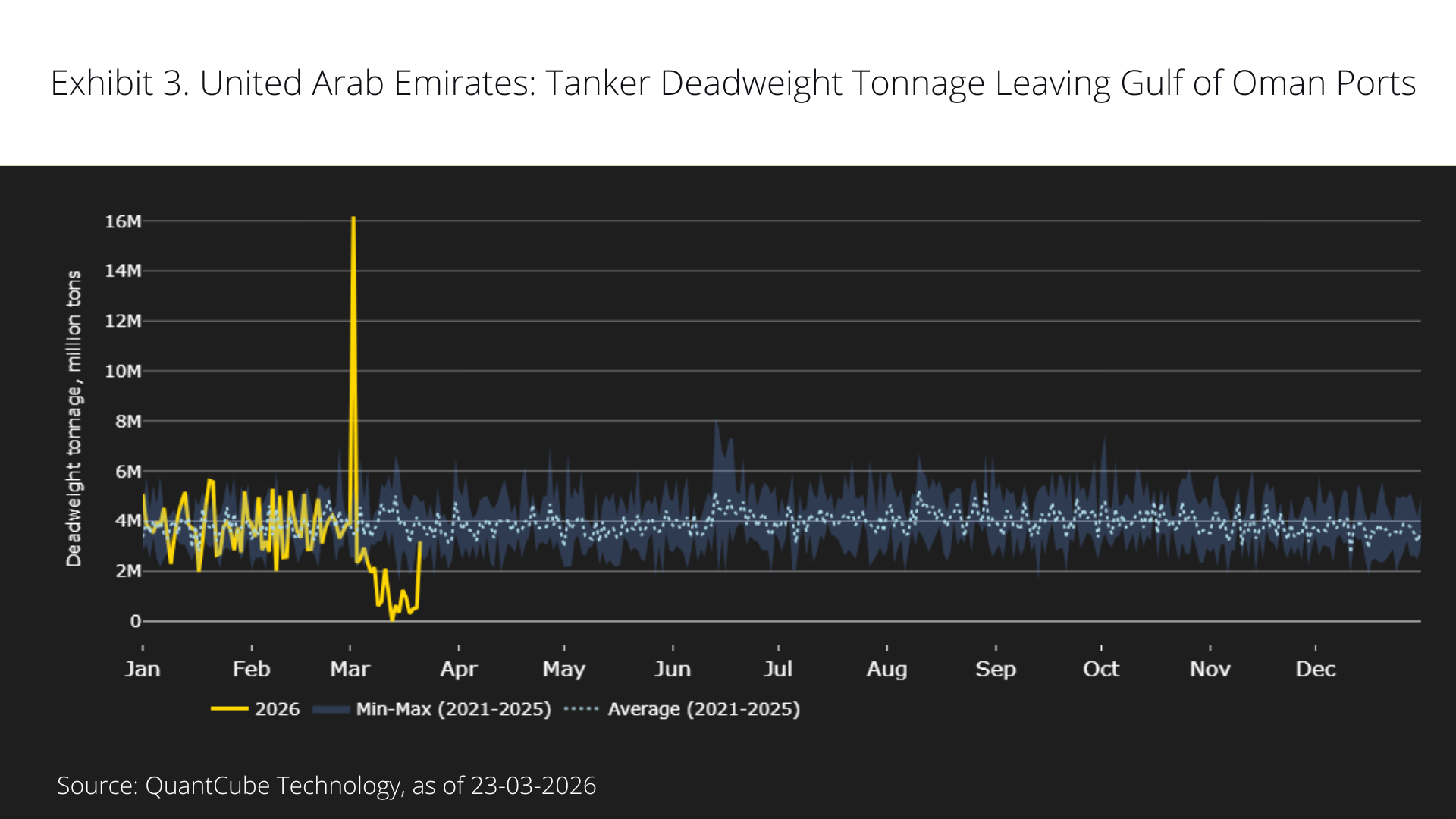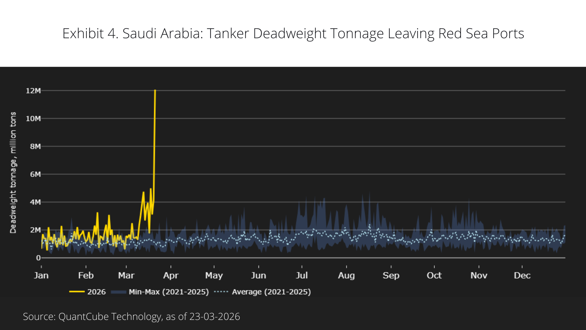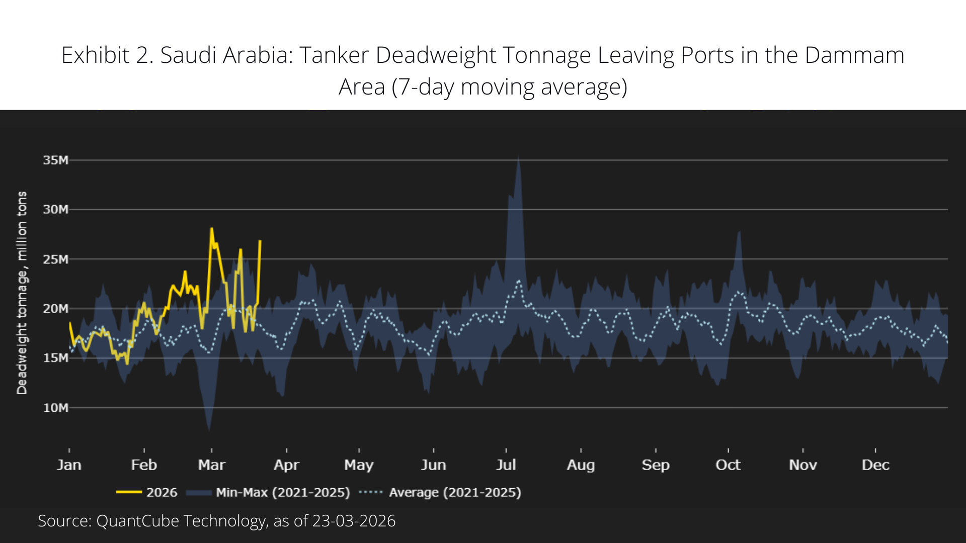 With onshore oil storage capacity rapidly constrained, vessels effectively became floating storage units. Loading activity accelerated in the early phase of the shock, but rather than queue at ports, tankers moved offshore – anchoring at distance while awaiting clarity. This dynamic is clearly captured in the sharp increase in deadweight tonnage exiting monitored port zones in Dammam region, as shown in Exhibit 2.